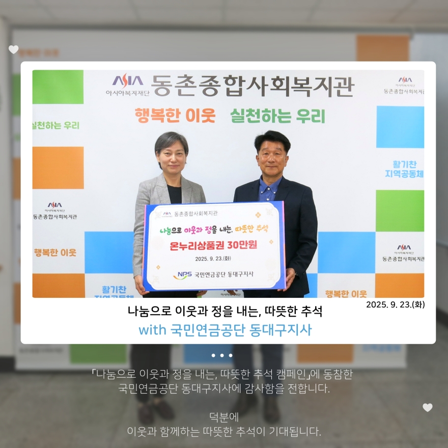 [³ª´®À¸·Î ÀÌ¿ô°ú Á¤À» ³»´Â, µû¶æÇÑ Ãß¼®]¿¡ µ¿ÂüÇÑ ±¹¹Î¿¬±Ý°ø´Ü µ¿´ë±¸Áö»ç °¨»çÇÕ´Ï´Ù. |