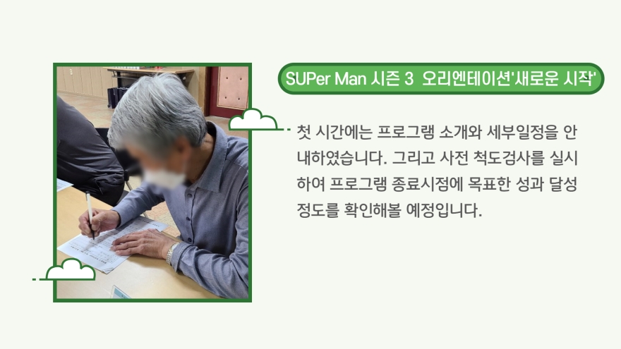 4¿ù 28ÀÏ(¸ñ) Áö¿ª ³» 60´ë 1ÀÎ ¼¼´ë ³²¼ºµéÀ» ´ë»óÀ¸·Î ½£À» Ȱ¿ëÇÑ °í¸³°¨ ¿¹¹æ ÇÁ·Î±×·¥ÀÎ Çູµ¿±¸Èñ¸ÁDream ½ÃÁð 3 '½£:er Man' ÇÁ·Î±×·¥ÀÇ ¿À¸®¿£Å×À̼ÇÀÌ ½Ç½ÃµÇ¾ú½À´Ï´Ù.