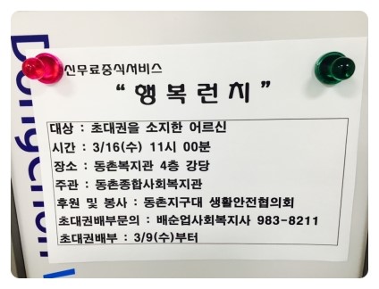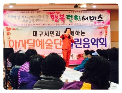 µ¿Ã̺¹Áö°ü°ú µ¿ÃÌÁö±¸´ë »ýȰ¾ÈÀüÇùÀÇȸ°¡ ÇÔ²²ÇÏ´Â Áö¿ª ¾î¸£½Å Á¡½É ³ª´® Çà»ç "Çູ ·±Ä¡" º¹Áö°ü °´çÀÇ º¯½ÅÀº ¹«ÁË~!! ¾ÆÄ§ ÀÏÂï ¾î¸£½ÅµéÀ» ¸ÂÀÌÇϱâ À§ÇÑ ¼Õ±æµéÀÌ ºÐÁÖ ÇÕ´Ï´Ù~ ¾Æ»ç´Þ ¿¹¼ú´Ü ¼±»ý´Ôµé²²¼´Â ¹«´ë ¼¼ÆÃÀ» ÇϽðí Á÷¿øµéÀº °´ç¿¡¼ÀÇ °ø¿¬°ü¶÷°ú ½Ä»ç¸¦ À§ÇÑ ¼¼ÆÃÀ» ÂøÂø~~~
