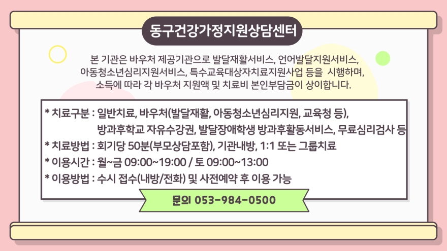 µ¿±¸°Ç°°¡Á¤Áö¿ø»ó´ã¼¾ÅÍ¿¡¼ ºÎ¸ð¾çÀ° TIPÀ» µå¸®°íÀÚ Çб³Æø·Â ¿¹¹æ°ú ÁöÇý·Î¿î ´ë󹿹ýÀ» ÁغñÇß½À´Ï´Ù! Æø·ÂÀº ¹«¾ùÀÎÁö, °¡ÇØÇлýÀÇ ½É¸® µîÀ» »ìÆìº¸¸ç ³» ¾ÆÀÌÀÇ ½É¸®µµ ºÐ¼®Çغ¾½Ã´Ù. Á¤±â»ó´ã ¹× ½É¸®Ä¡·á 053-984-0500 µ¿±¸°Ç°°¡Á¤Áö¿ø»ó´ã¼¾ÅÍ